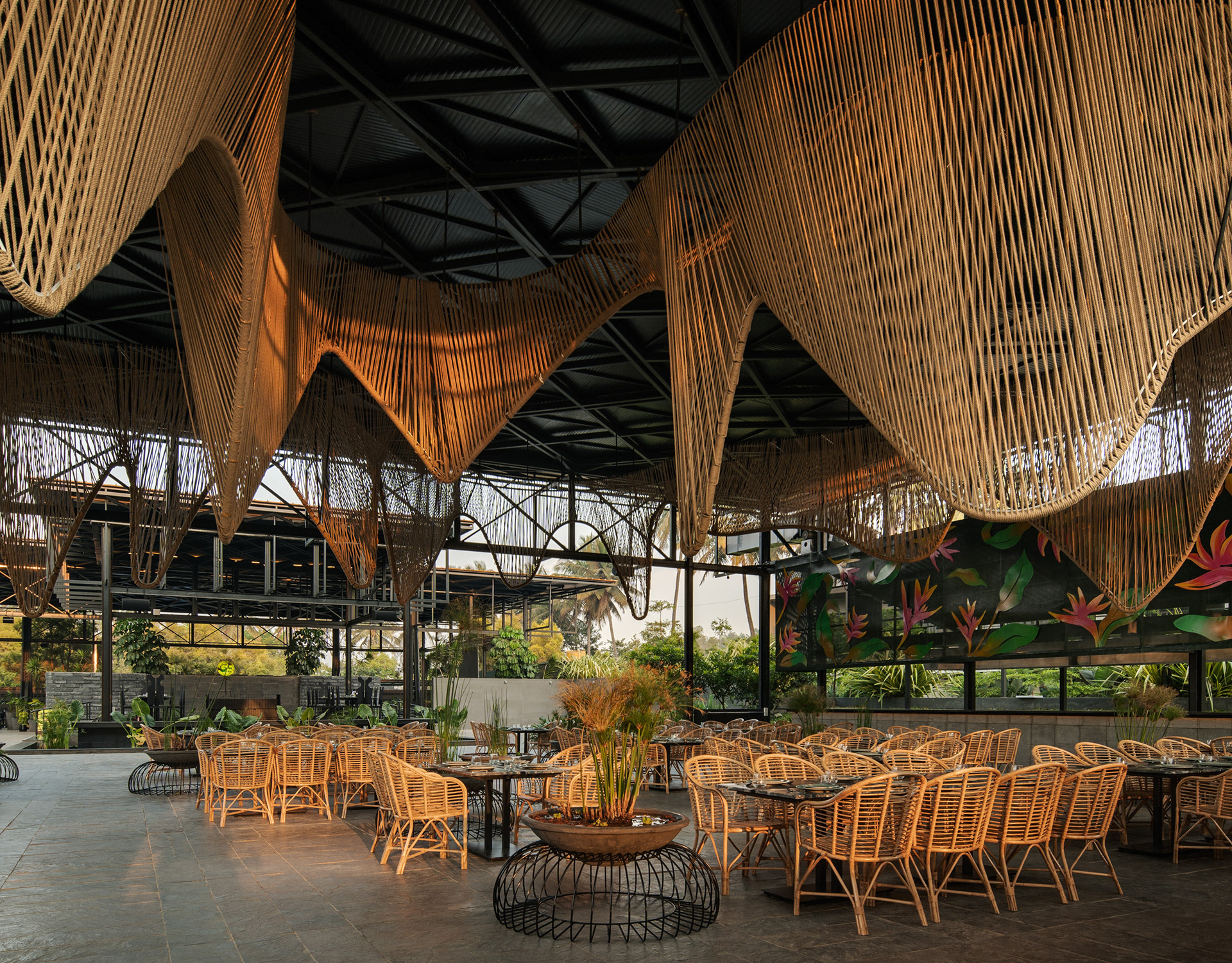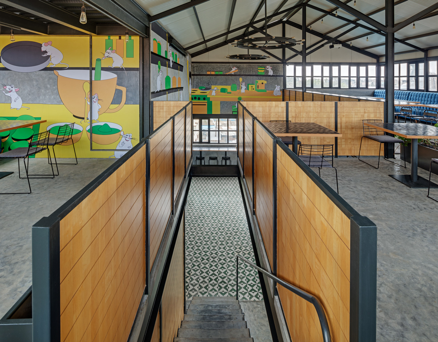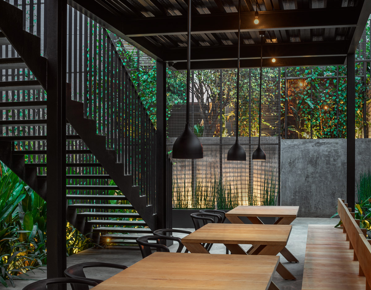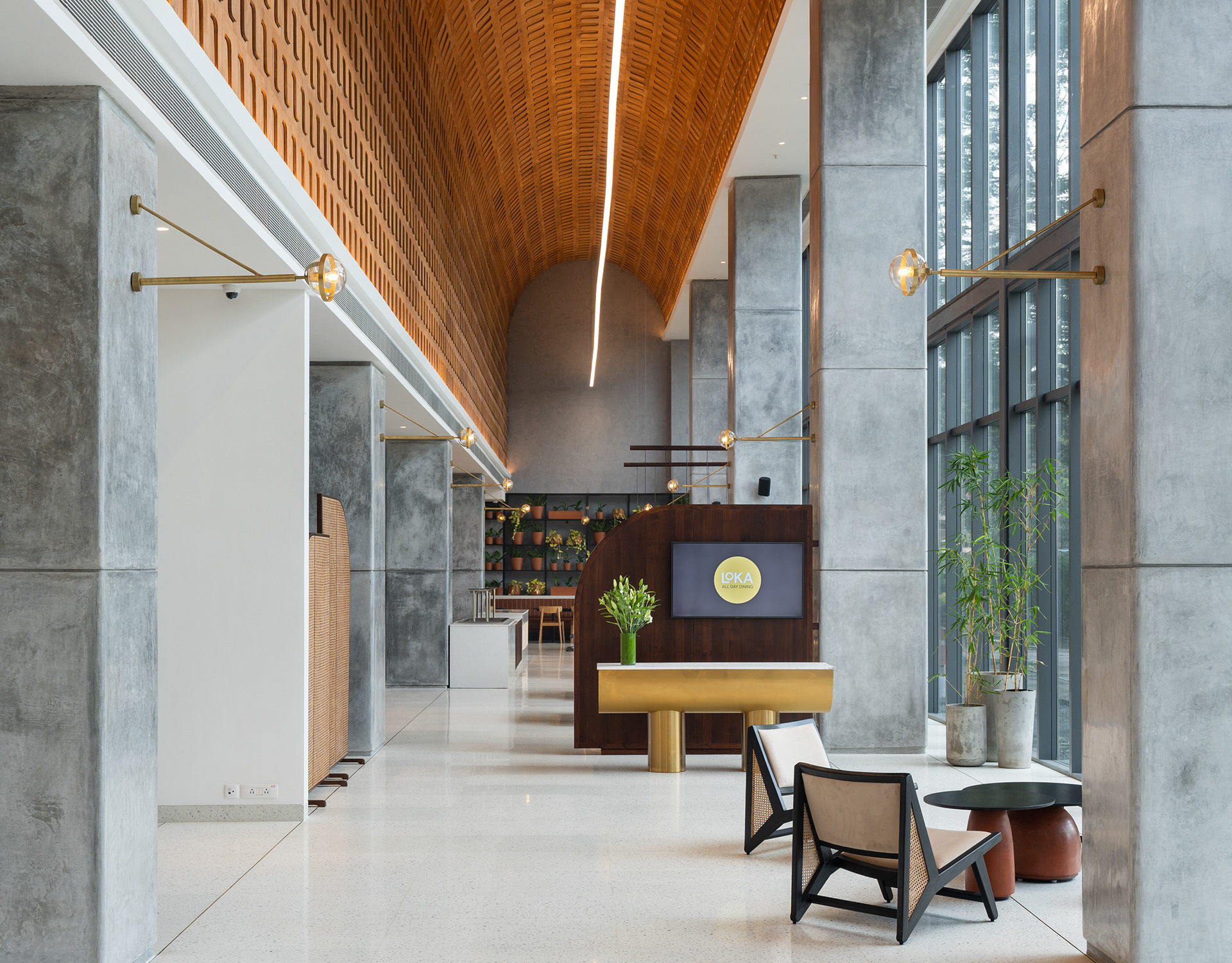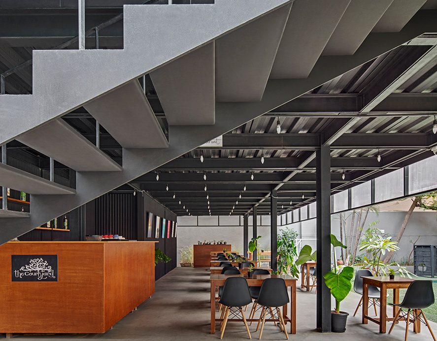 Sunrise is located in the industrial suburb of Bangalore. This project was conceived using affordable materials and parts of an existing building to keep project costs down. We wanted to create a cosy environment for this family-owned business. To achieve this, we chose to use simple, muted materials such as wood and concrete, and added plenty of vegetation.