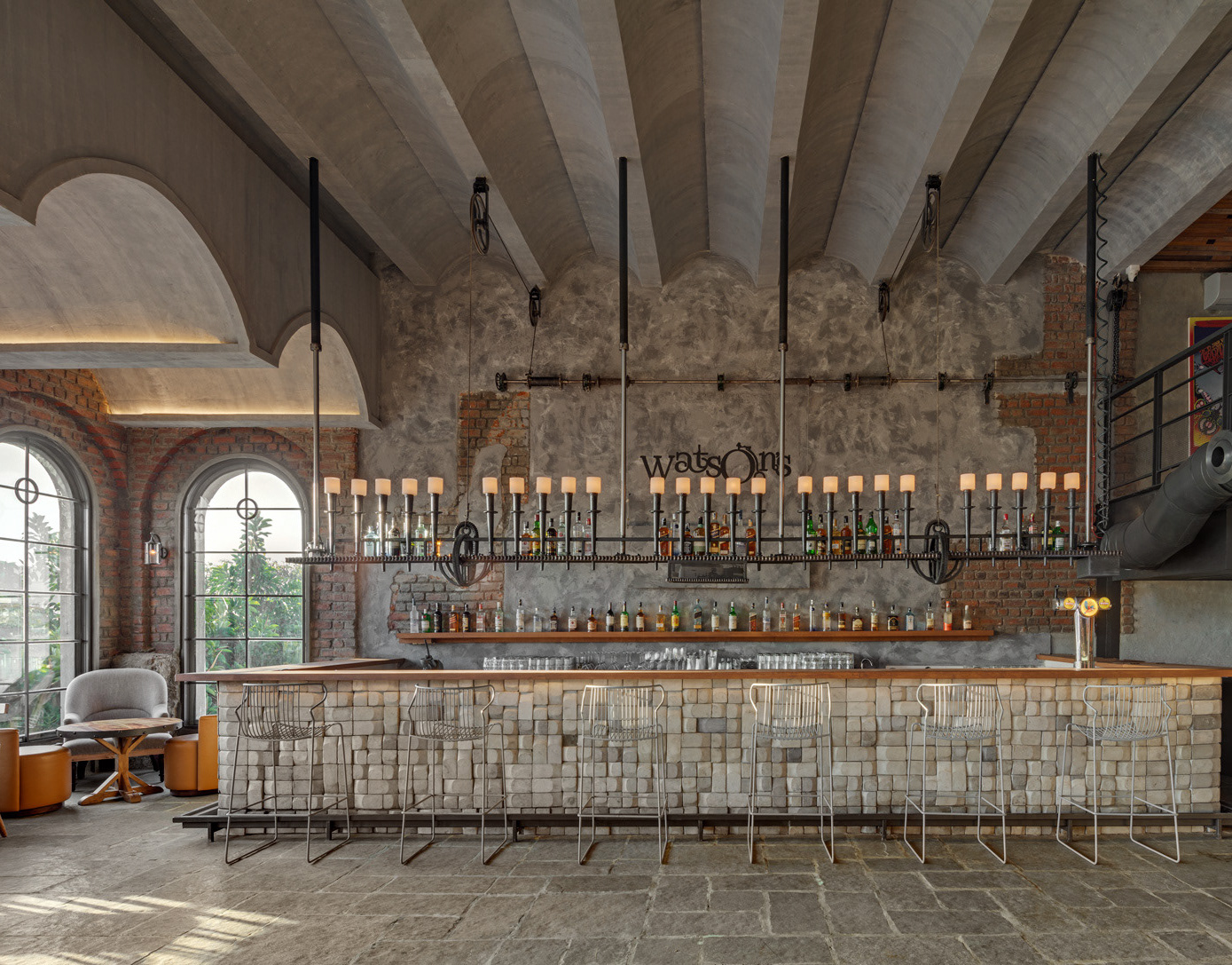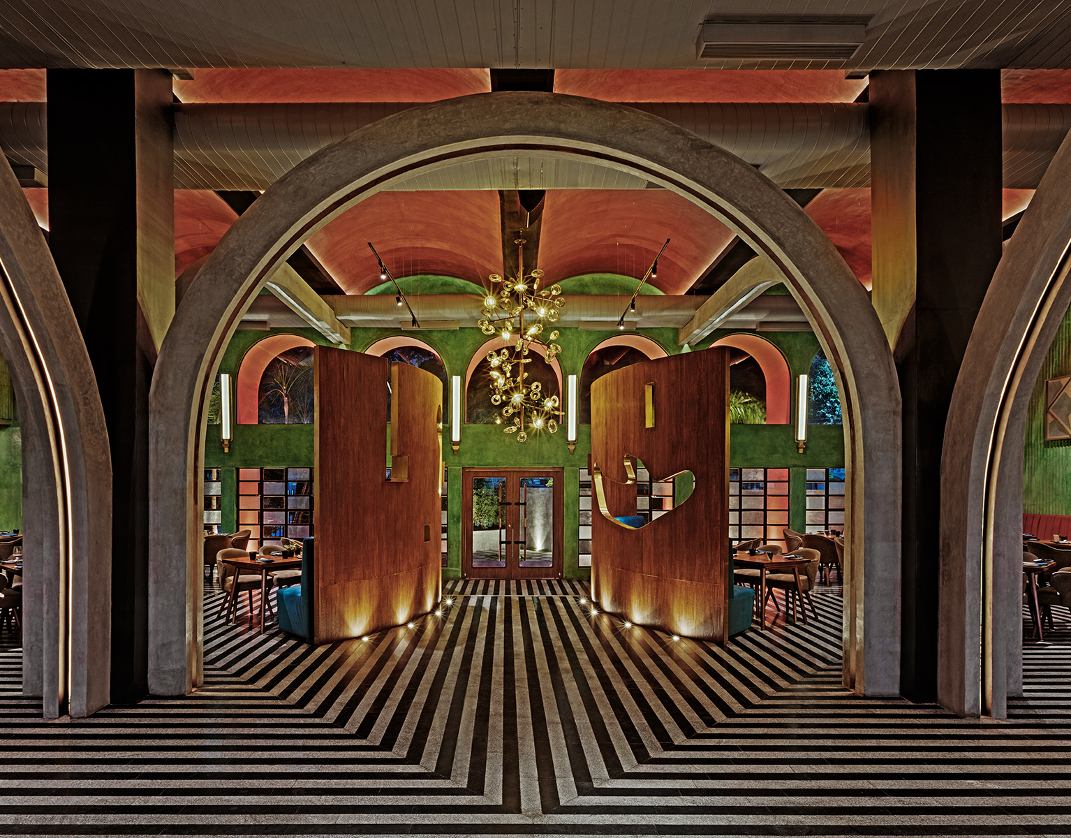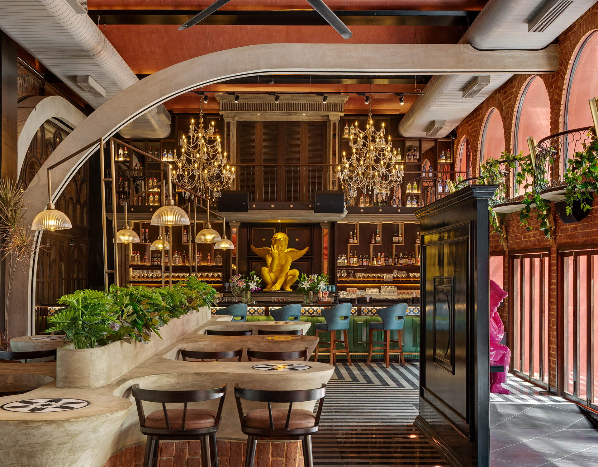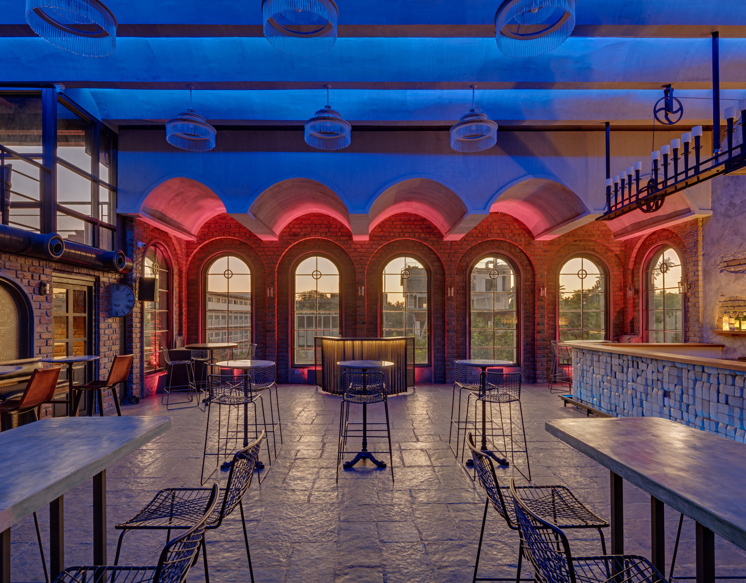 The Jaipur Bar Stock Exchange features Grand arches , classic details and decorations that aids in delivering similar experience. The space celebrates proportions that accentuates the scale of space . The arches adds layer as well as scale, and layer aids in achieving depth. The decoration gives classic attributes whereas accessories and decor gives contextual approach and the color pallet is modern in approach. The space is truly original in its style and is perfectly helmed transitional space that blends multiple styles, achieve contrast and concludes harmony.