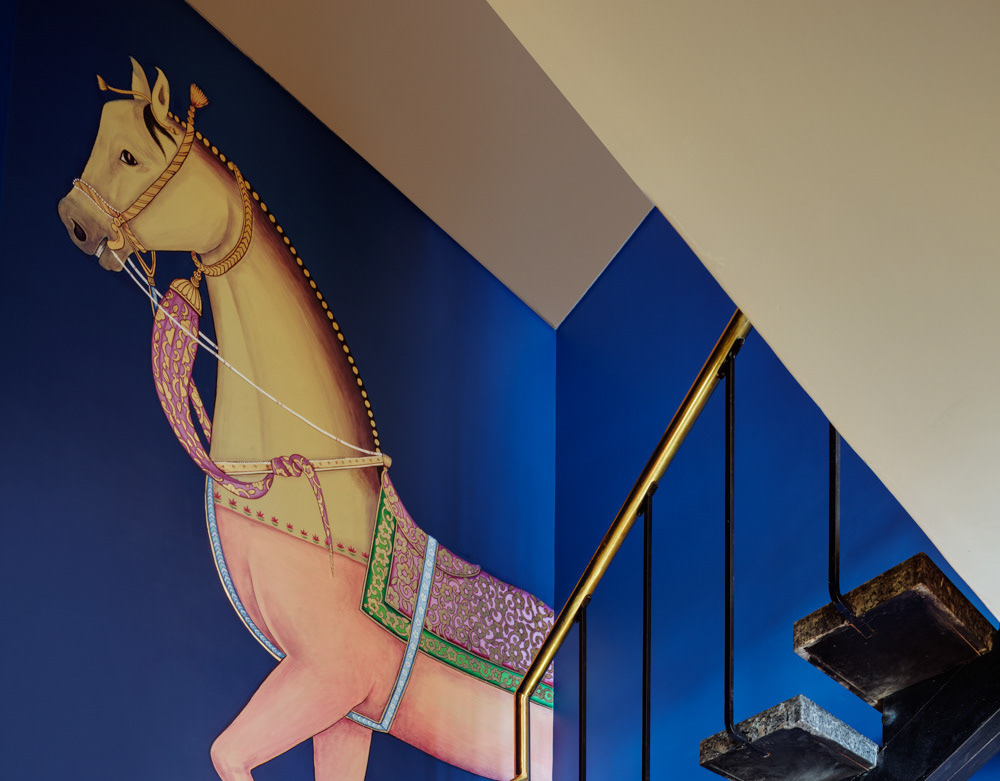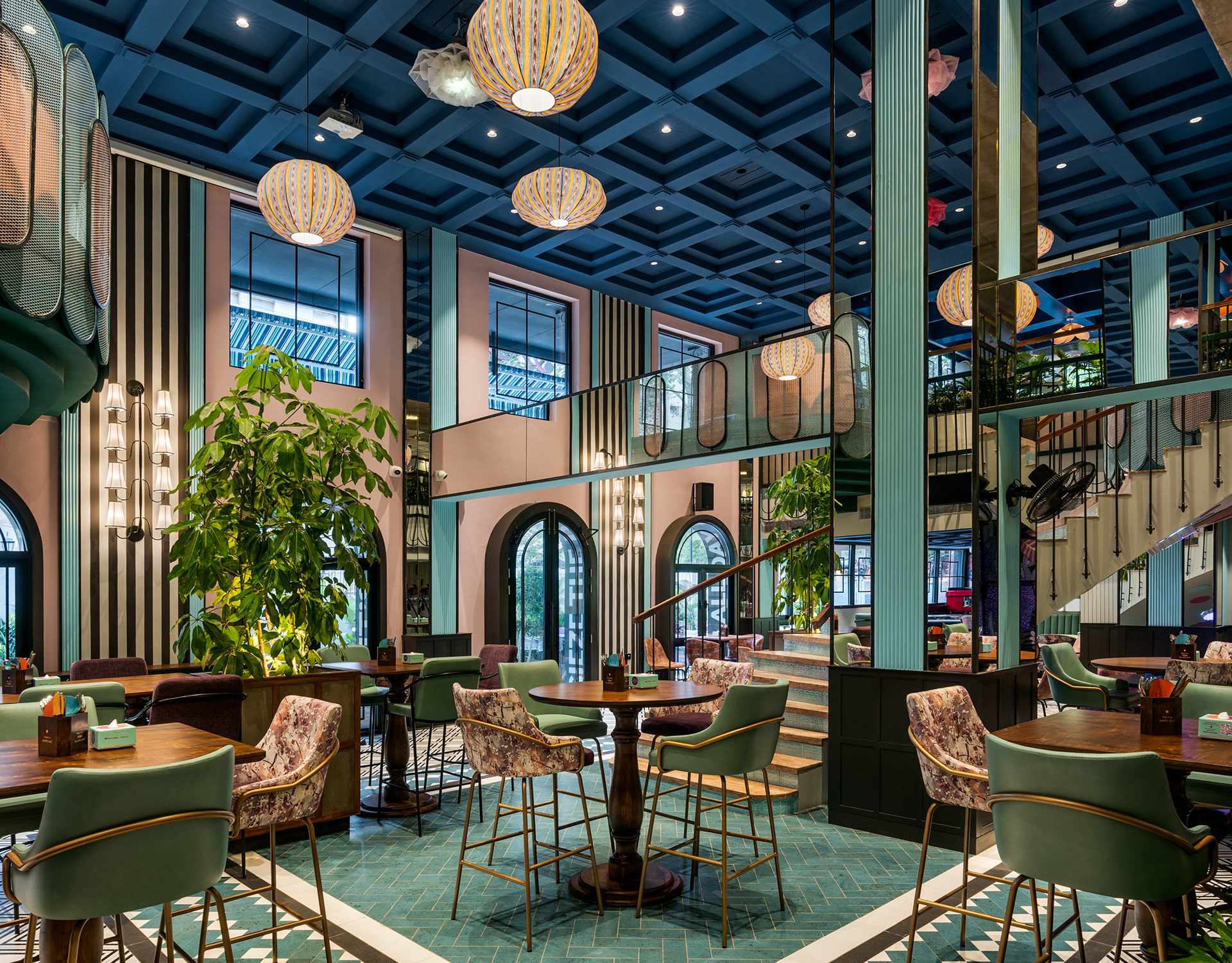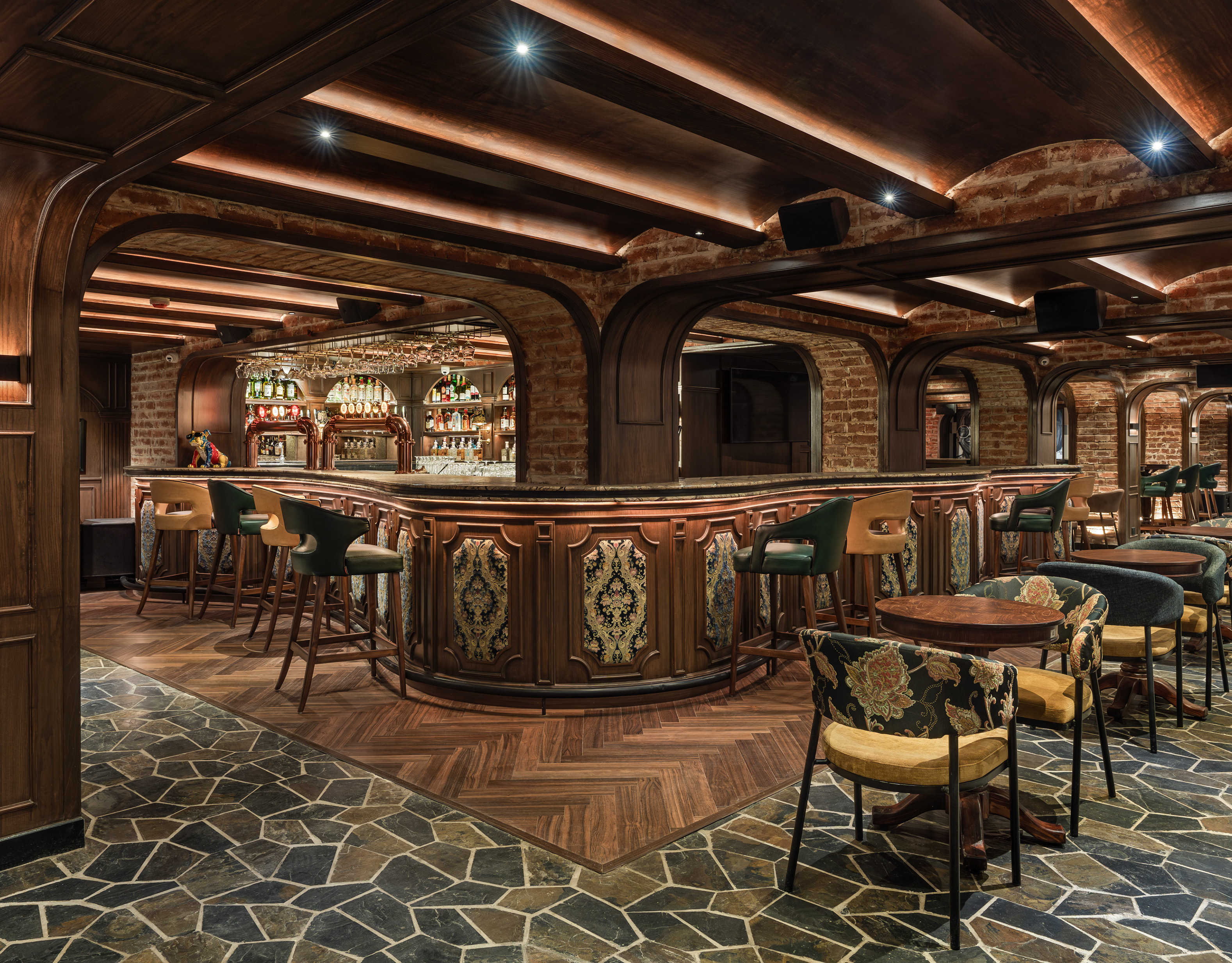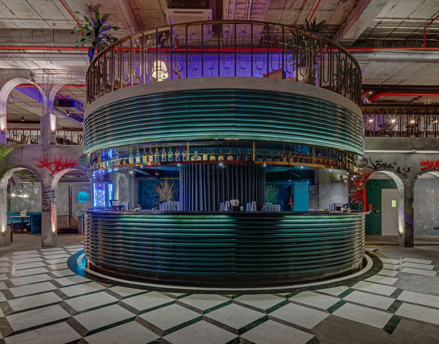 The Jaipur Bar Stock Exchange features Grand arches , classic details and decorations that aids in delivering similar experience. The space celebrates proportions that accentuates the scale of space . The arches adds layer as well as scale, and layer aids in achieving depth. The decoration gives classic attributes whereas accessories and decor gives contextual approach and the color pallet is modern in approach. The space is truly original in its style and is perfectly helmed transitional space that blends multiple styles, achieve contrast and concludes harmony.