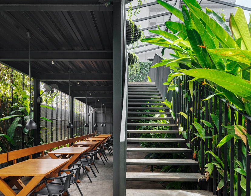 Planned as an extension, the space features an industrial look with exposed steel structure members painted in black and is located on a rooftop with ribbon windows that bring natural light into the space.