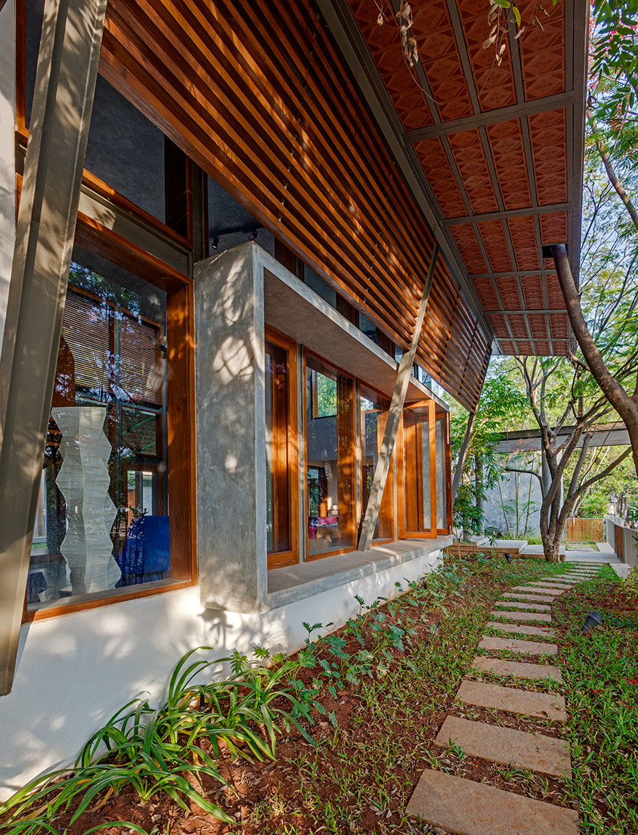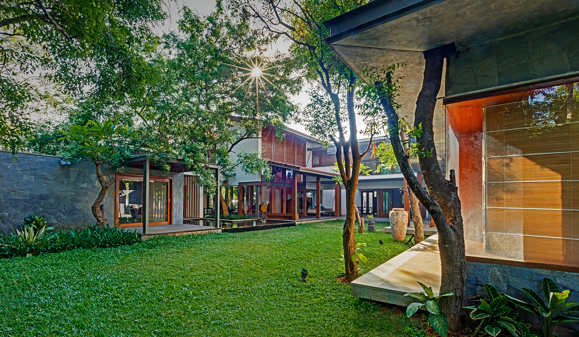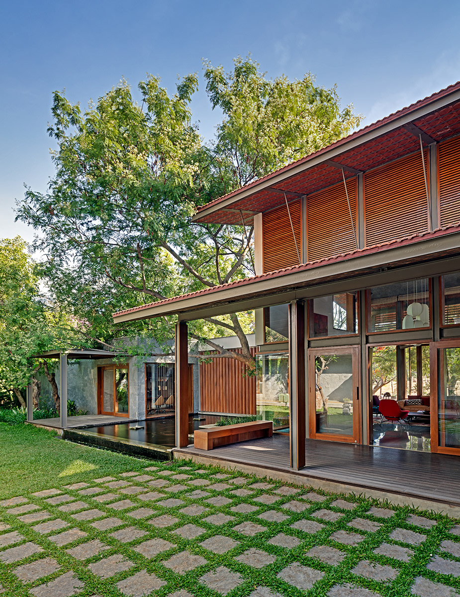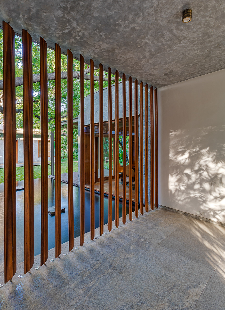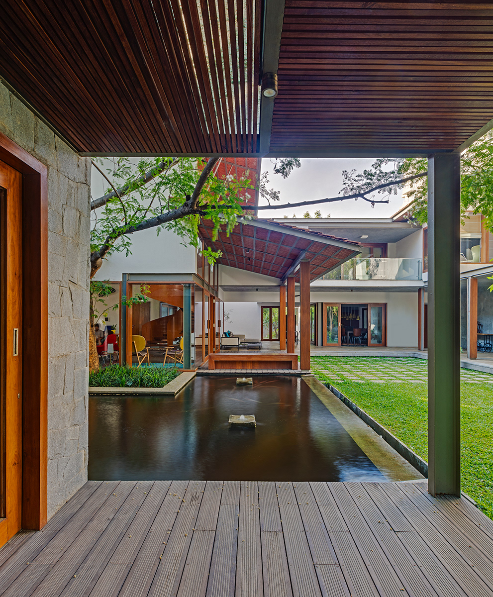 Krishnan House, Bangalore The 16,000 sft site of the Krishnan house had several existing trees and we envisioned a relatively low-slung architectural expression that would be interpretive of a vernacular aesthetic, while accommodating its green surroundings. An architecture of sloped Mangalore tiled roofs and rough-cut Shira stone cladding contrasts with floors of rough and polished Kota and joinery of teak.