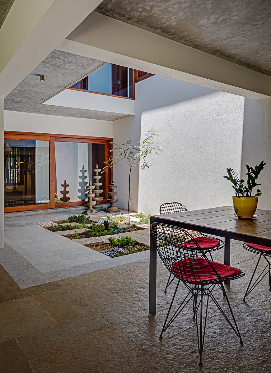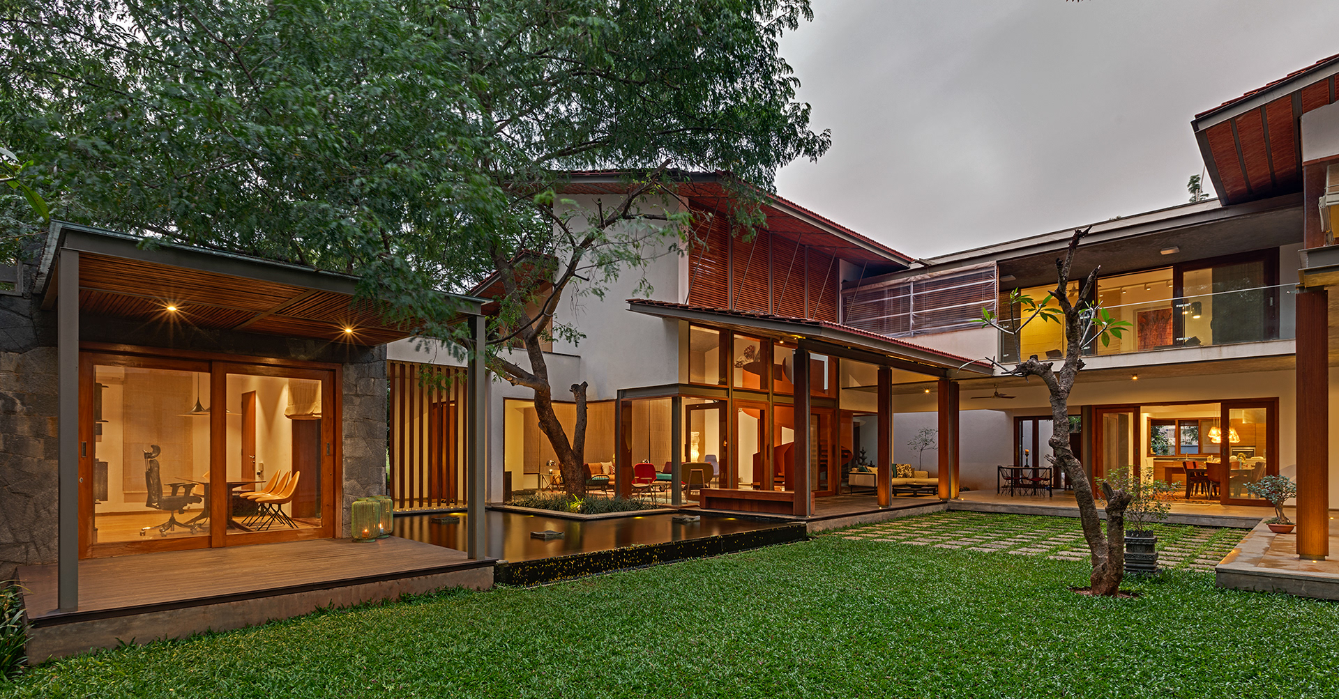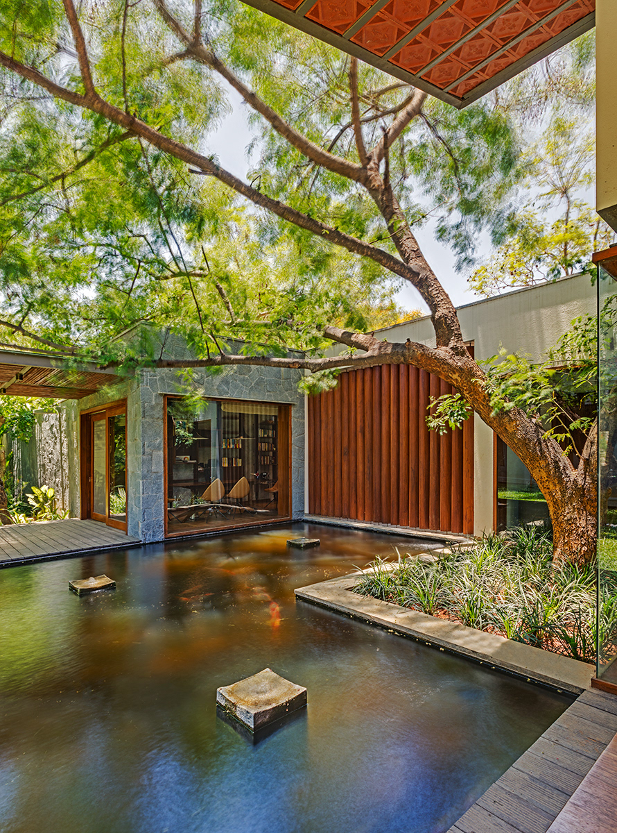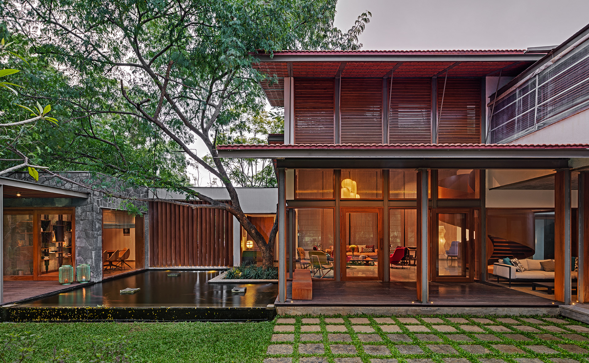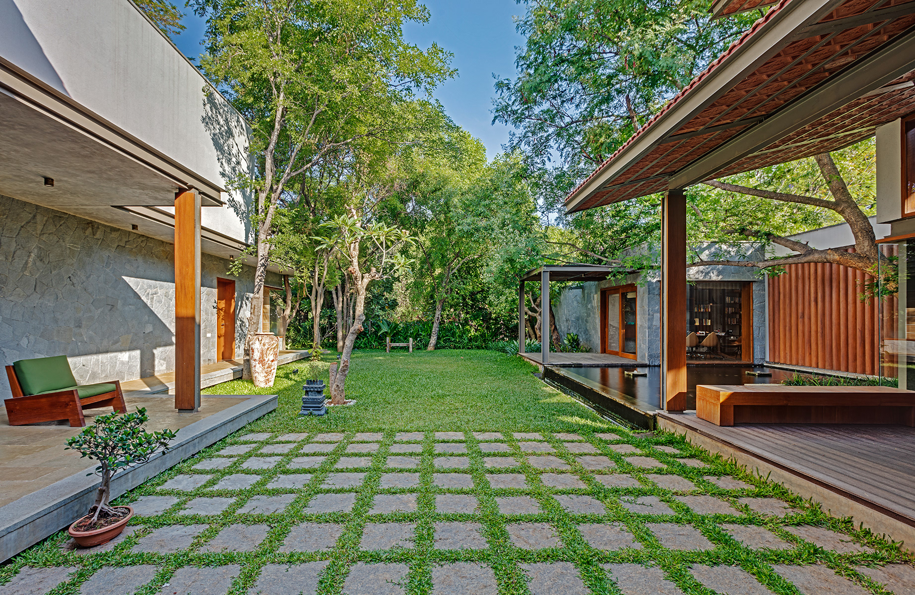 Krishnan House, Bangalore The 16,000 sft site of the Krishnan house had several existing trees and we envisioned a relatively low-slung architectural expression that would be interpretive of a vernacular aesthetic, while accommodating its green surroundings. An architecture of sloped Mangalore tiled roofs and rough-cut Shira stone cladding contrasts with floors of rough and polished Kota and joinery of teak.