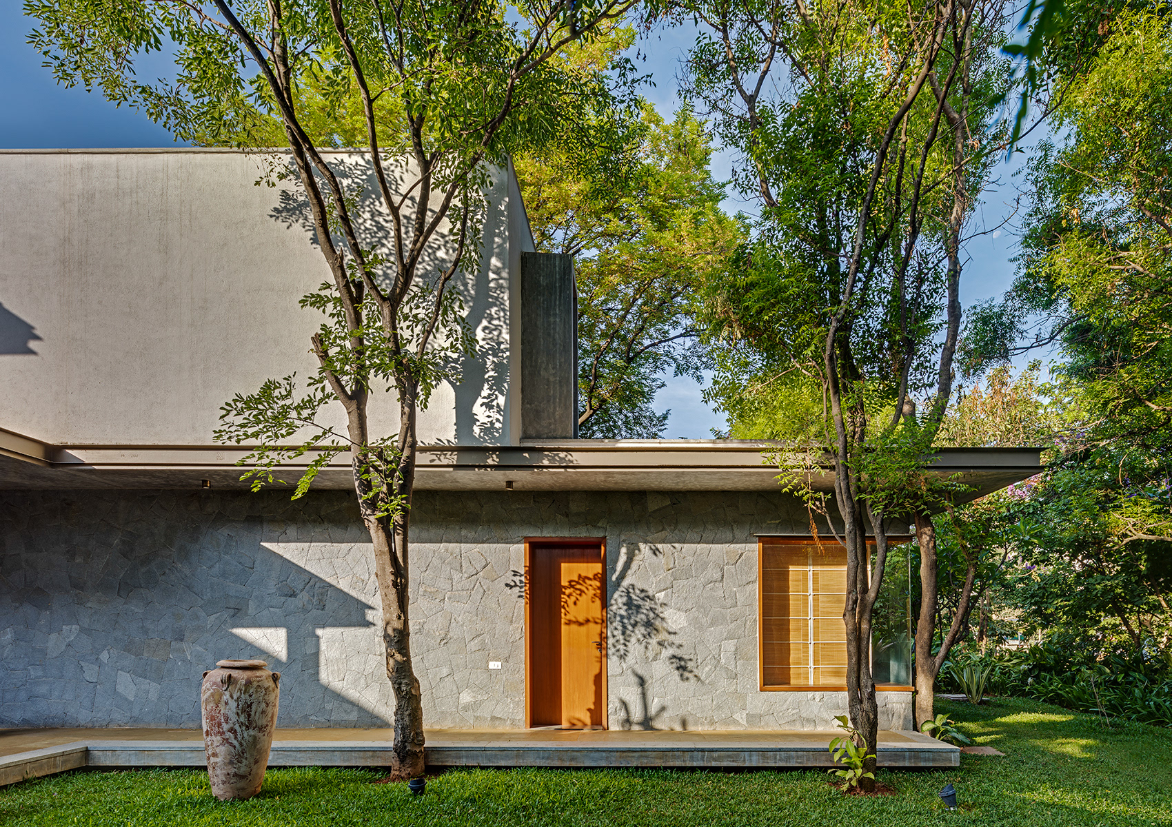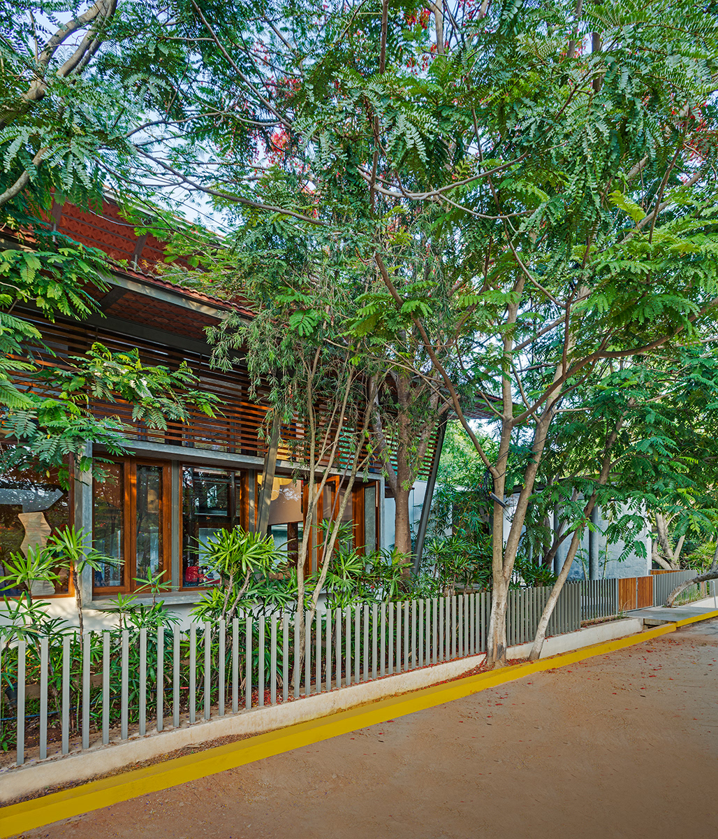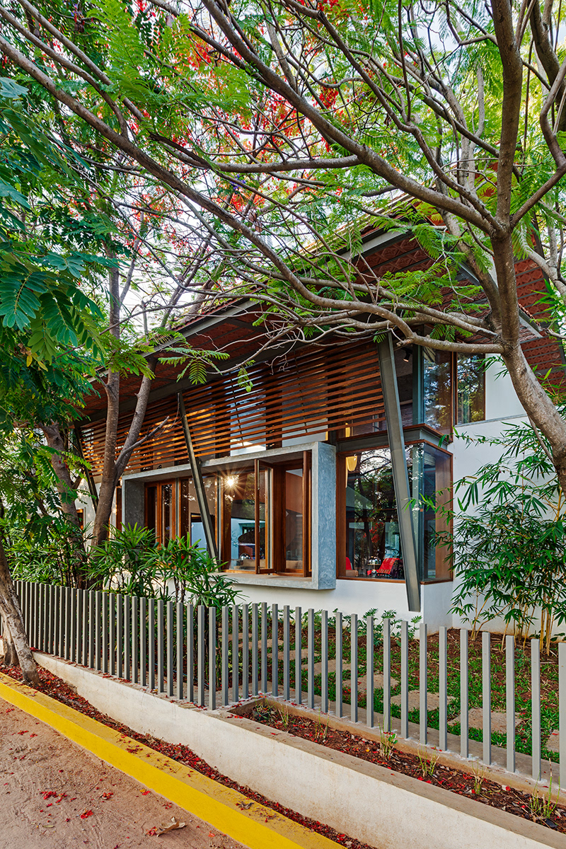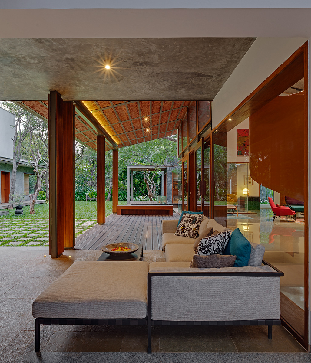 Krishnan House, Bangalore The 16,000 sft site of the Krishnan house had several existing trees and we envisioned a relatively low-slung architectural expression that would be interpretive of a vernacular aesthetic, while accommodating its green surroundings. An architecture of sloped Mangalore tiled roofs and rough-cut Shira stone cladding contrasts with floors of rough and polished Kota and joinery of teak.