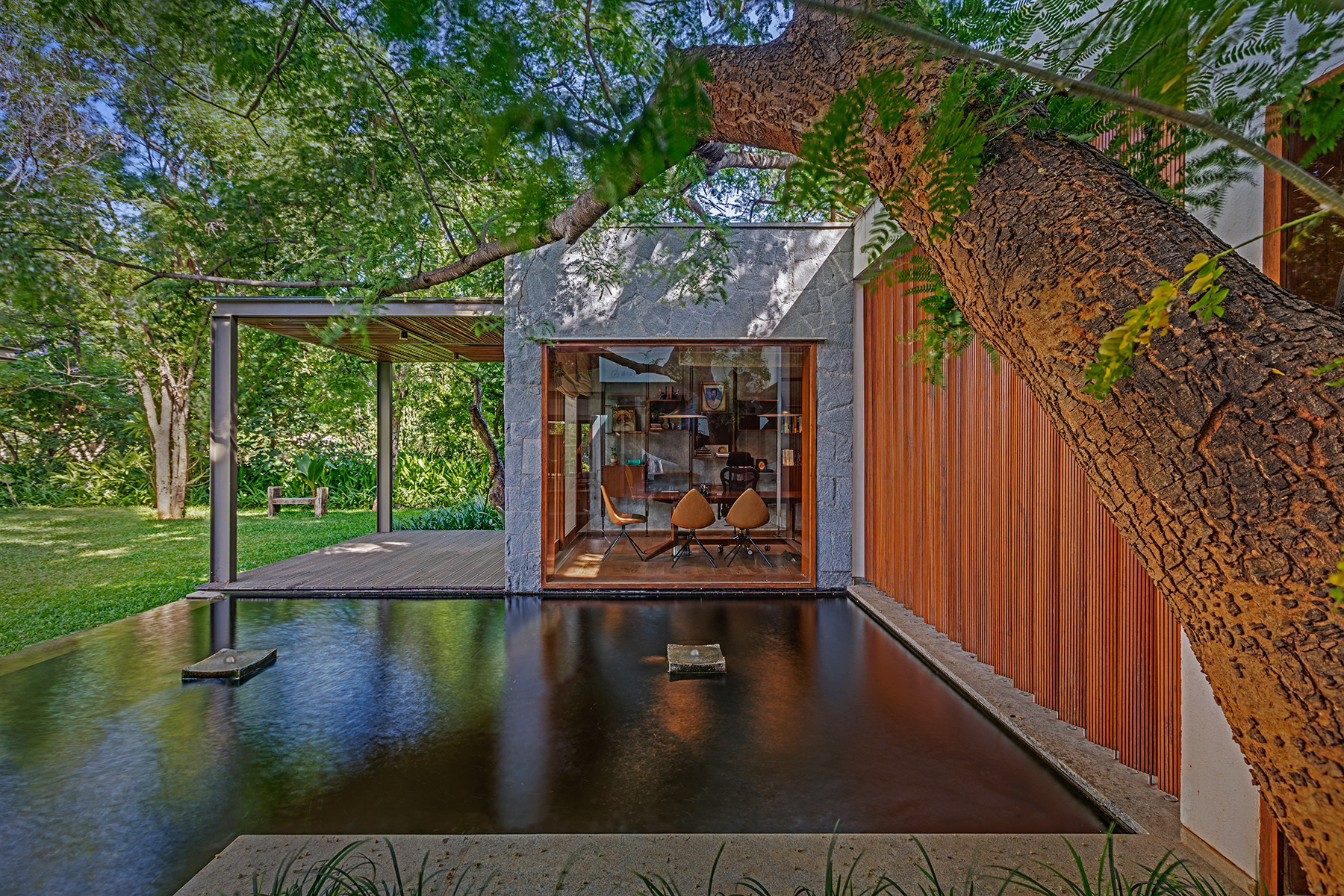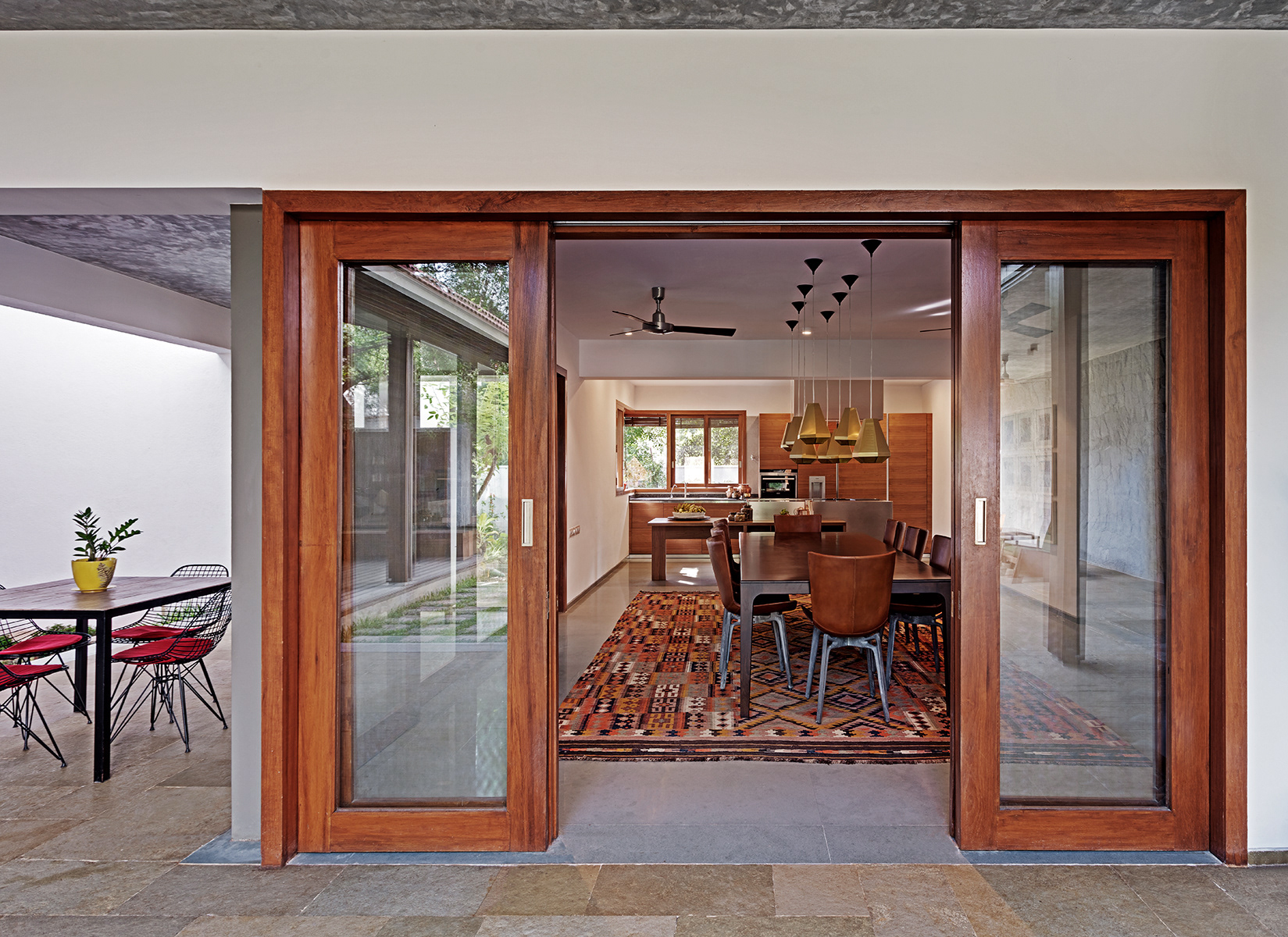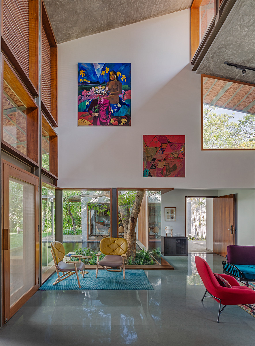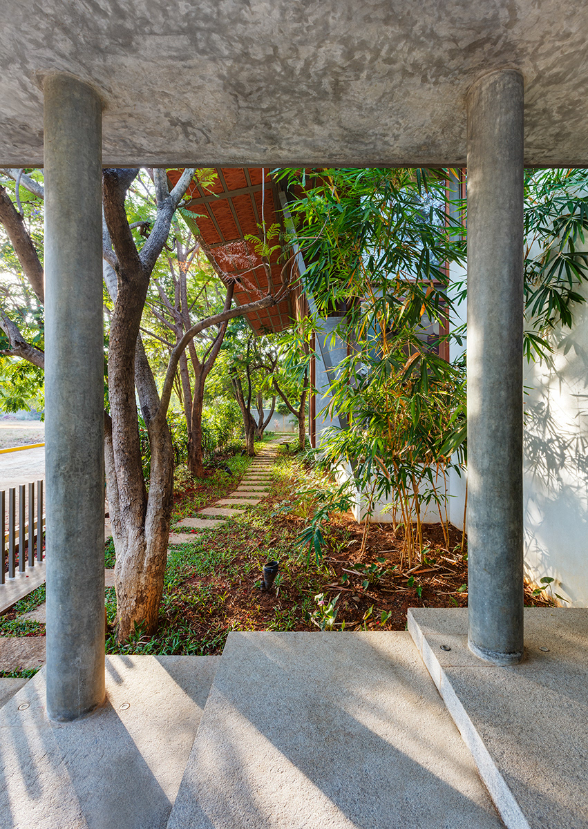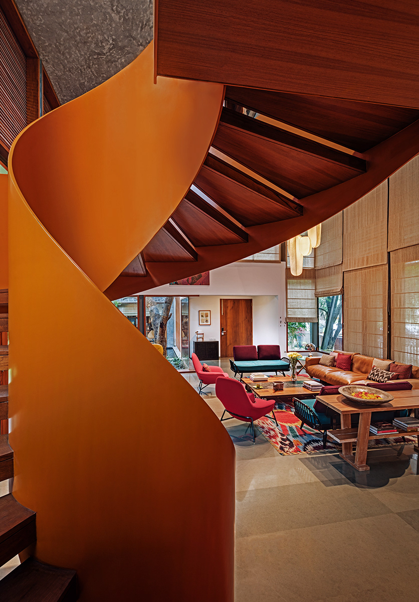 Krishnan House, Bangalore The 16,000 sft site of the Krishnan house had several existing trees and we envisioned a relatively low-slung architectural expression that would be interpretive of a vernacular aesthetic, while accommodating its green surroundings. An architecture of sloped Mangalore tiled roofs and rough-cut Shira stone cladding contrasts with floors of rough and polished Kota and joinery of teak.