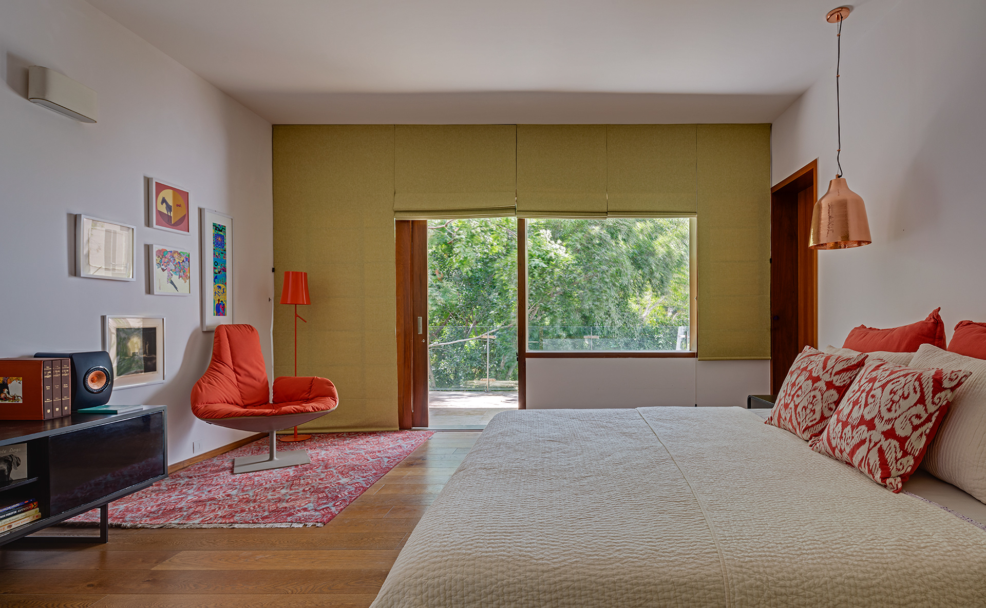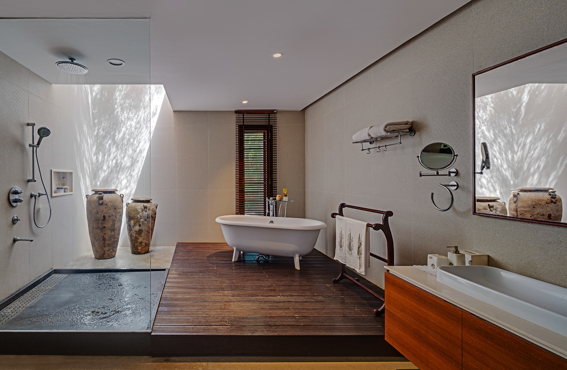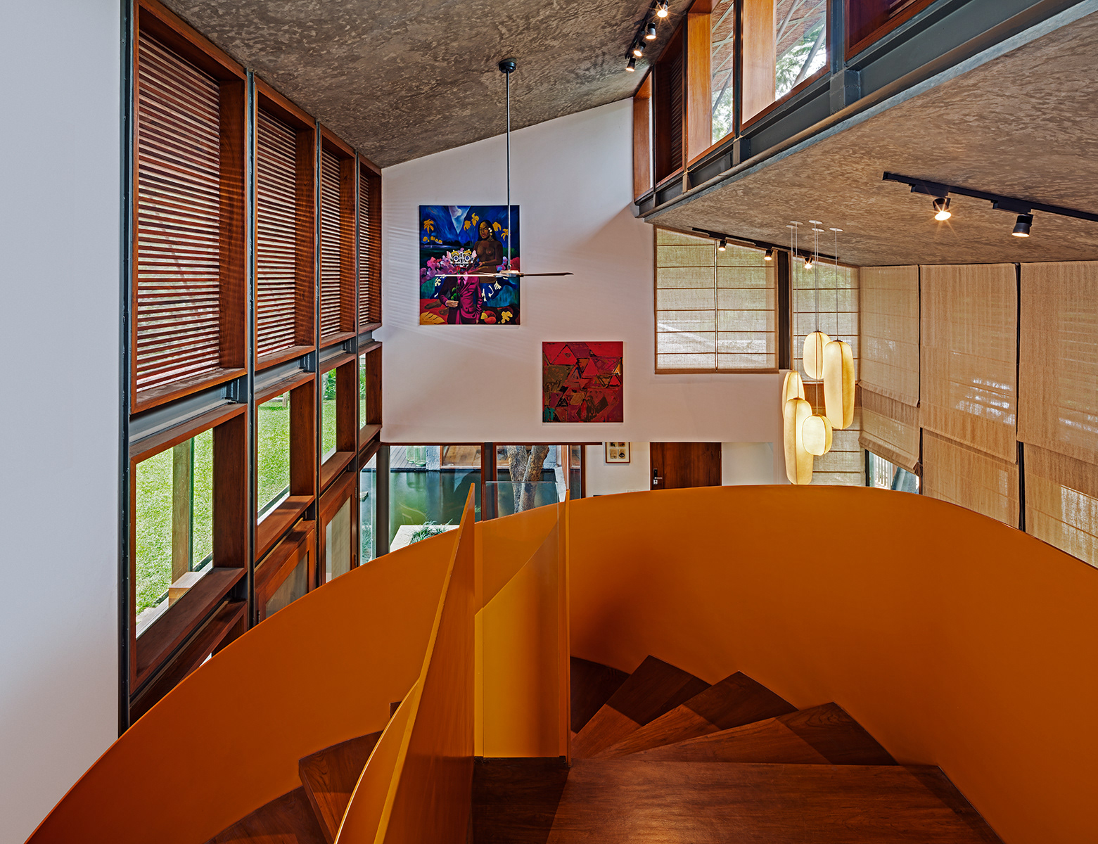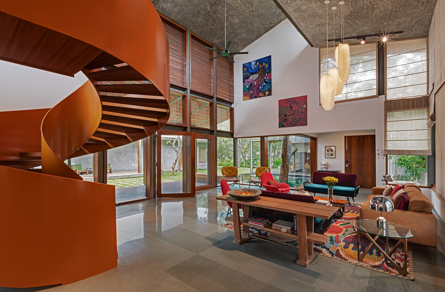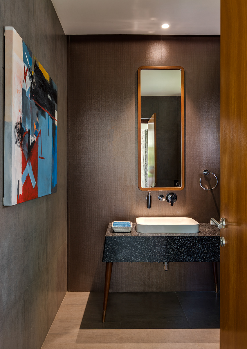 Krishnan House, Bangalore The 16,000 sft site of the Krishnan house had several existing trees and we envisioned a relatively low-slung architectural expression that would be interpretive of a vernacular aesthetic, while accommodating its green surroundings. An architecture of sloped Mangalore tiled roofs and rough-cut Shira stone cladding contrasts with floors of rough and polished Kota and joinery of teak.