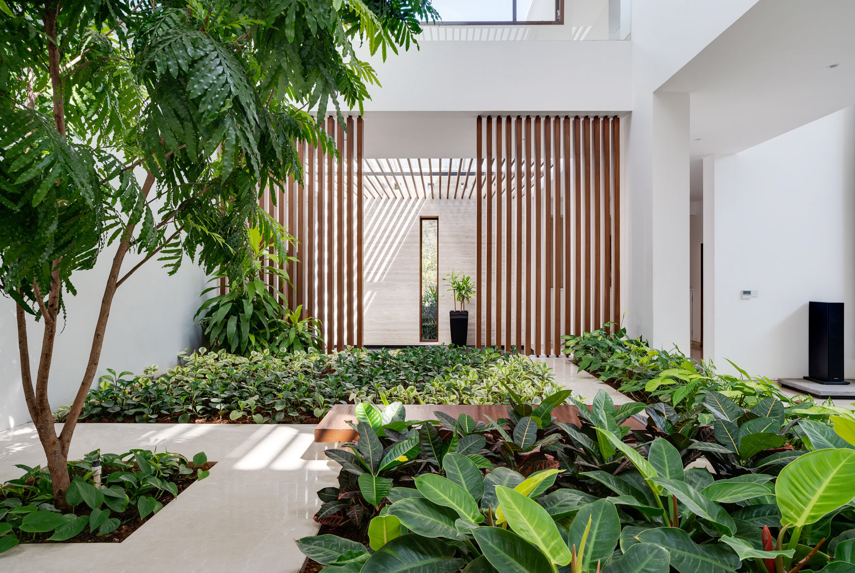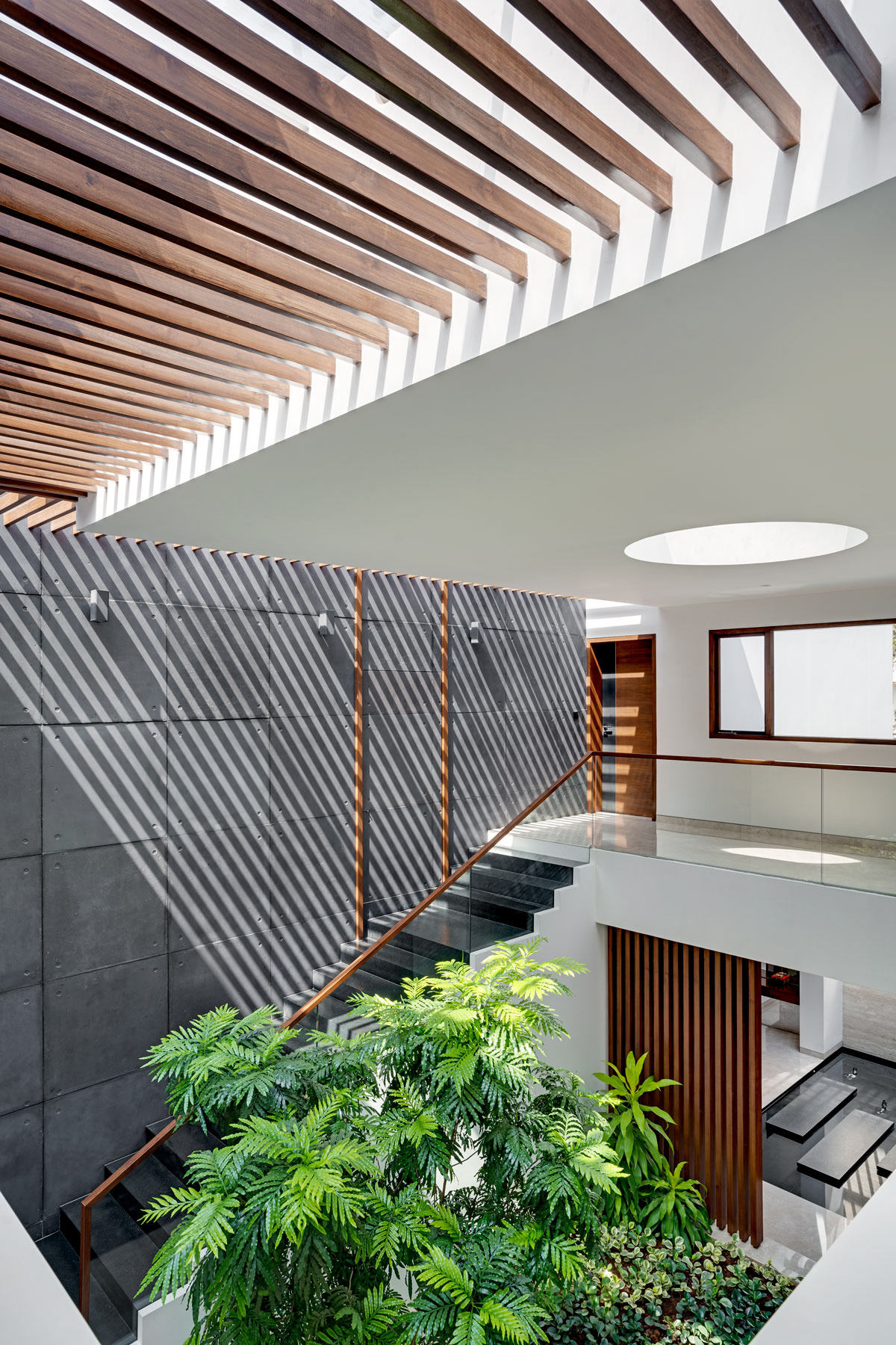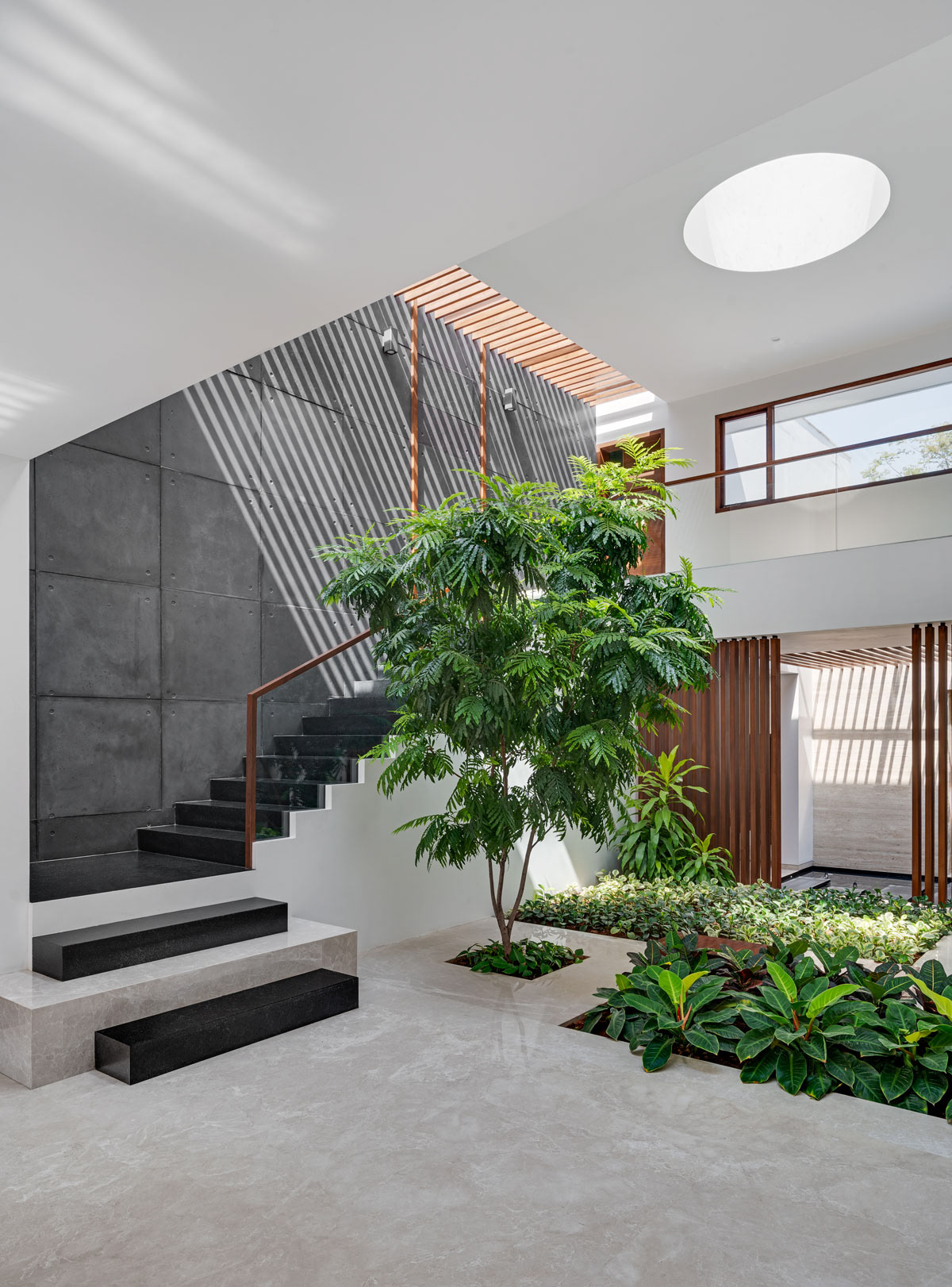 A residential project designed by Collage Architects in Bengaluru. The entire house designed with lots of light and shade. The Indoor garden and tree makes the house more tropical.